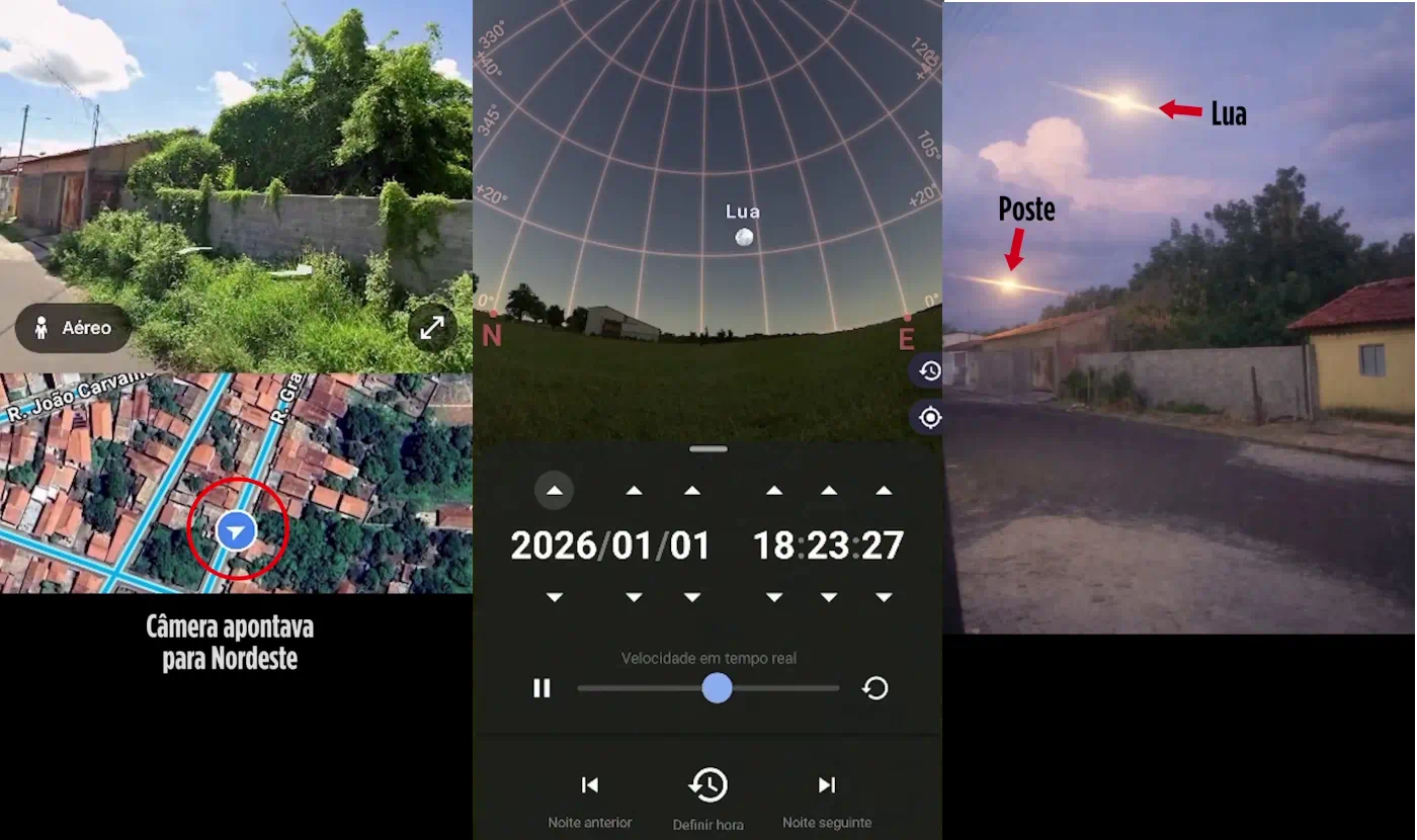 O entusiasta mais fervoroso talvez queira protestar, lembrando que a reportagem esteve no local e mostrou que “não existem postes de iluminação” e o morador disse que a Lua não estava no céu neste dia. Mas foi a própria reportagem que permitiu rapidamente elucidar o caso, através do olhar experiente do analista de imagens Jorge Uesu. Parceiro do Portal Vigília e de outros grupos dedicados à divulgação responsável do fenômeno UFO na Internet, o pesquisador primeiro verificou que, ao contrário do que disse a testemunha, a Lua estava no céu do Piauí (e de todo o Brasil) em 1º de janeiro.