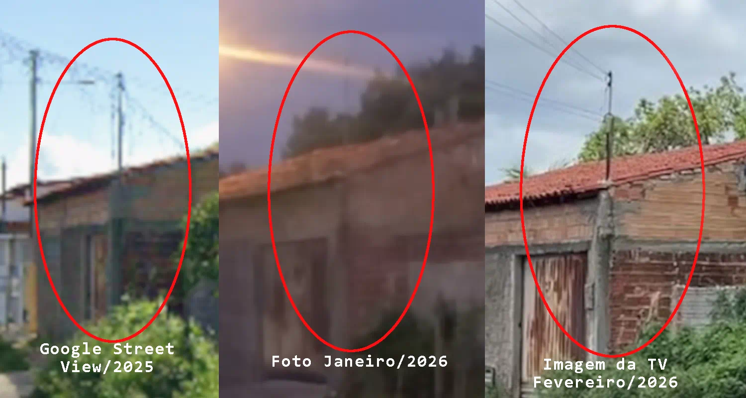 Mas a análise mais apurada da imagem também indica outra pegadinha. Apesar da reportagem afirmar que a imagem teria sido “avaliada por um perito” para atestar que não houve uso de edição por inteligência artificial, a comparação entre imagens recentes dos imóveis, tanto feitas pelo Google Street View (de 2025) quanto as imagens da própria matéria da TV mostram mudanças grosseiras na composição.