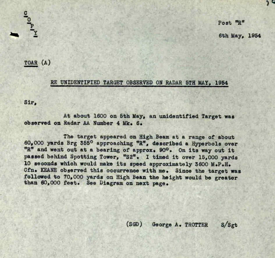 “O alvo apareceu no feixe superior a uma distância de cerca de 60.000 jardas, azimute 355°, aproximando-se de ‘R’, descreveu uma hipérbole sobre ‘R’ e saiu em um azimute de aproximadamente 90°. Em sua trajetória de saída, passou por trás da Torre de Observação ‘S2’. Cronometrei o percurso de 15.000 jardas em 10 segundos, o que tornaria sua velocidade de aproximadamente 3.600 milhas por hora. O Cfn. KEANE observou esta ocorrência comigo. Como o alvo foi acompanhado até 70.000 jardas no feixe superior, a altitude seria superior a 60.000 pés. Veja o diagrama na próxima página.
